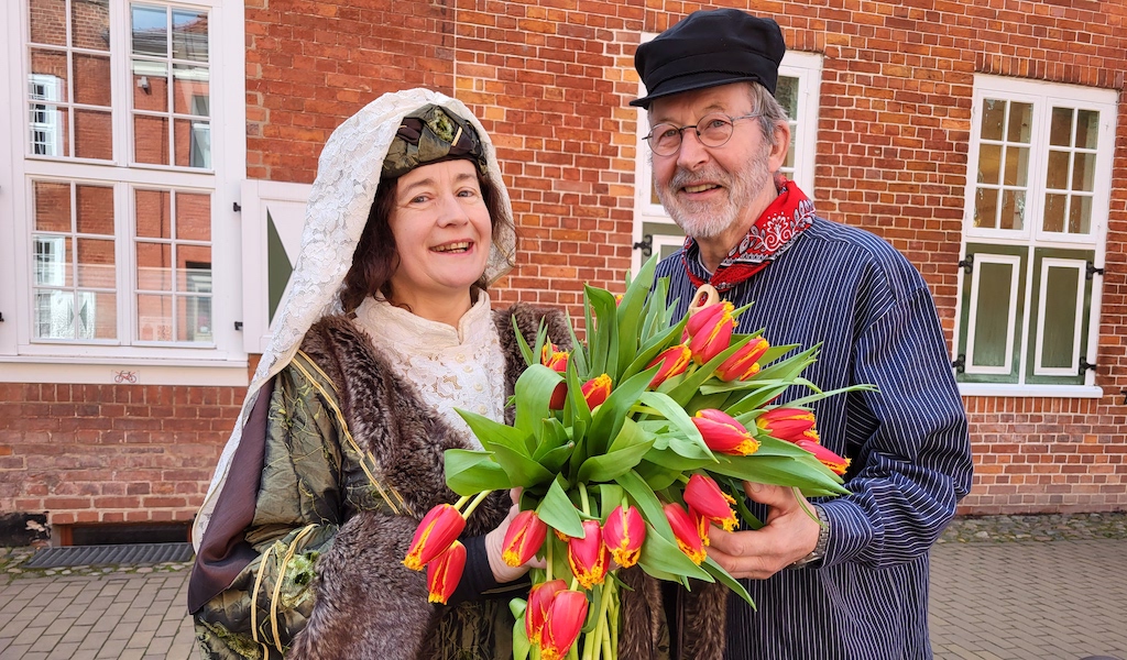 Jacoba van Beieren, Frau Marita Müller, und Wolfgang Raab, Mitglied im Förderverein zur Pflege Niederländischer Kultur in Potsdam e.V, vor dem Jan Bourmann Haus, im Holländischen Viertel, Mittelstraße 8 ,benannt nach dem niederländischen Baumeister. Das barocke Typenhaus wurde originalgetreu restauriert und dauerhaft der Öffentlichkeit zugänglich gemacht. Im Erdgeschoss befindet sich eine Ausstellung zum Holländischen Viertel.