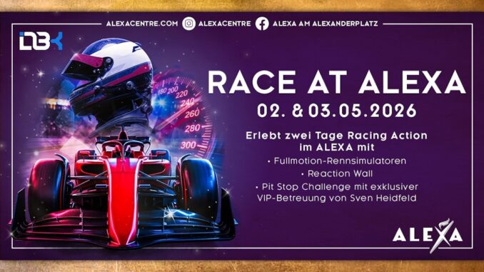 Am ersten Maiwochenende veranstaltet das ALEXA am Alexanderplatz das interaktive Event „Race at ALEXA“ für die ganze Familie rund um das Thema Motorsport. Ob beim virtuellen Fahrspaß an modernen Fullmotion-Rennsimulatoren mit XXL-Gaming-Bildschirmen oder beim Geschicklichkeitstest an der Reaction Wall – im Mittelpunkt stehen die gemeinsamen Erlebnisse für Groß und Klein. Ein besonderes Highlight erwartet die Gäste bei der Pit Stop Challenge: Sven Heidfeld, bekannt aus dem Motorsport, steht für Profi-Tipps bereit und sorgt für echte VIP-Momente. Alle Besucherinnen und Besucher sind herzlich eingeladen, aktiv zu werden und mitzumachen – im Team oder auch gegeneinander. Die Aktion findet am 02. und 03. Mai jeweils von 13 bis 18 Uhr im Erdgeschoss des Centers (vor H&M und Zara) statt.