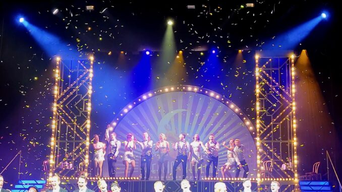 Tanzwunder Josephine Baker versetzt Herren und Damen mit ekstatischen Bewegungen in helle Aufregung, die Comedian Harmonists, die erste „Boyband“ der Welt, erinnern an den weiten Weg bis zu ihren das Jahrhundert überdauernden Ohrwürmern wie „Der kleine grüne Kaktus“, „Ein Freund, ein guter Freund“, die Revuegirls schwingen ihre Beine, während das BERLIN BERLIN-Orchestra mit über 30 zeitgemäß arrangierten deutschen und englischsprachigen Glanznummern von „Bei mir bist du schön“, über „Ich bin von Kopf bis Fuß auf Liebe eingestellt“, „Puttin’ on the Ritz“ oder „Mackie Messer“ furios aufspielt. Die Zuschauer klatschen, wippen auf ihren Stühlen, und es herrscht auch Stille, Beklemmung als es im Saal donnert, ein Hakenkreuz auf der Bühne zu sehen ist.