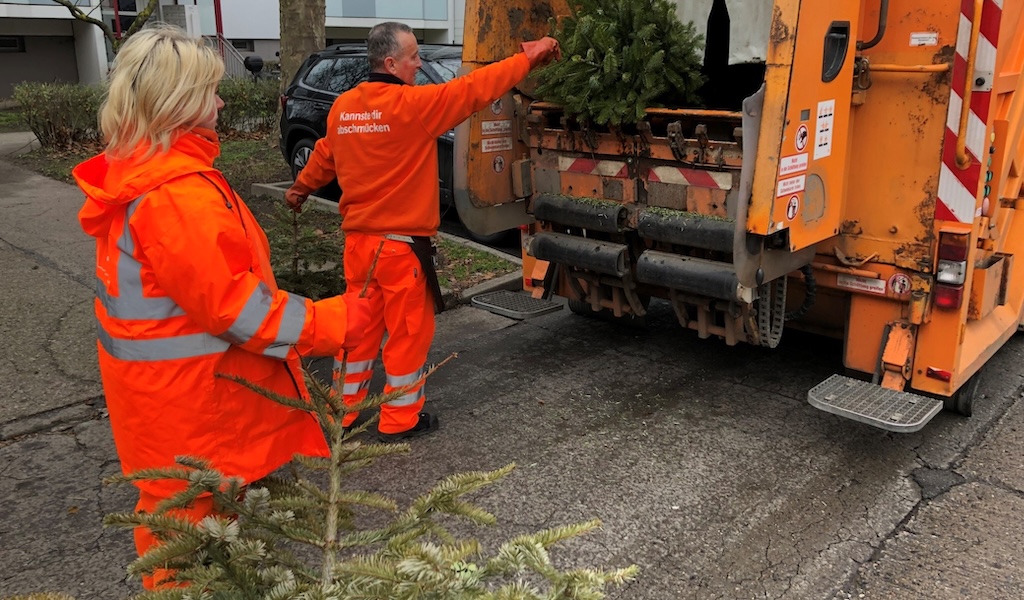 BSR-Beschäftigte bei der Abholung ausrangierter Weihnachtsbäume © BSR BSR-Beschäftigte bei der Abholung ausrangierter Weihnachtsbäume © BSR