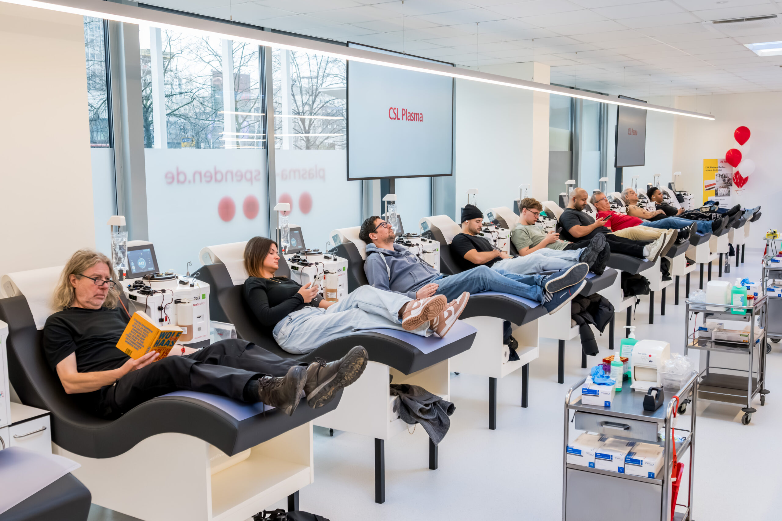 Eröffnung des CSL-Plasma von der Berliner Alexanderstraße. Hier zu sehen: Ab dem ersten Tag viel los: Der neue Spenderaum bietet Platz für bis zu 45 Liegen.