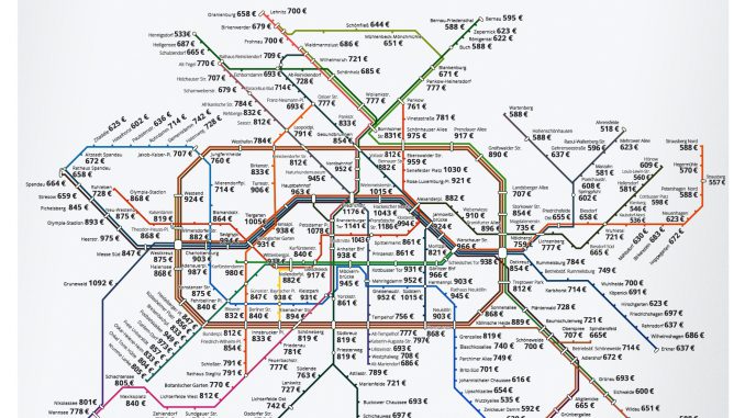Das Maklerportal ImmoScout 24 hat sich die in seinem Portal veröffentlichten Mietangebote innerhalb des Berliner S-Bahnrings angeschaut und für die einzelnen U- und S-Bahnhöfe die durchschnittlich geforderten Miethöhen für 70qm große Wohnungen errechnet.