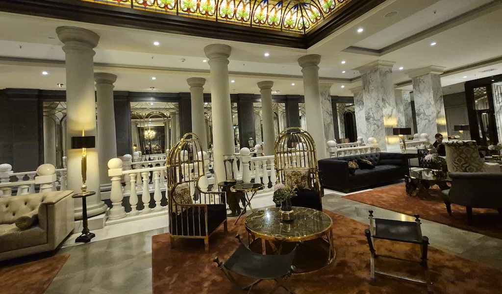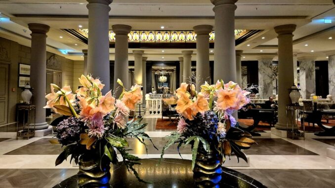 Dank der guten Lage und Anbindung erreichte ich das Hotel nach wenigen Gehminuten von der U-Bahn-Station Stadtmitte. Es befindet sich in einem denkmalgeschützten Gebäude, das früher als Kostümmagazin der Staatsoper Unter den Linden diente. Im März 2015 öffnete dort das neue 5-Sterne-Hotel seine Türen. Schon beim Betreten beeindruckt die prachtvolle Lobby: edle Teppiche, weiße Säulen, vergoldete Spiegel, üppige Blumendekorationen und glitzernde Kronleuchter – ein Ort voller Eleganz.