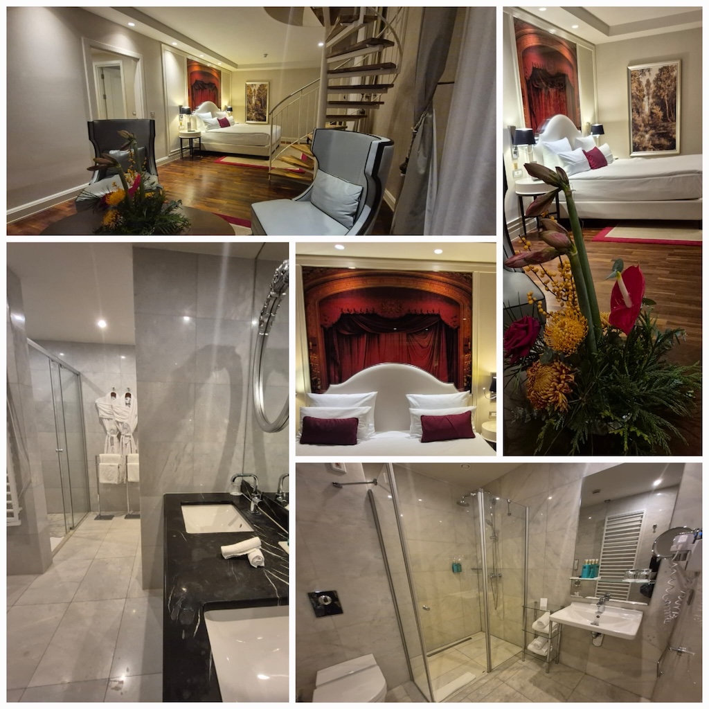 Nach einem kleinen Empfang folgte ein Rundgang durch das Haus. Es verfügt über 208 Zimmer, darunter neun Suiten und fünf Duplex-Suiten, verteilt auf sechs Etagen. Die Zimmer sind modern, stilvoll und komfortabel ausgestattet – mit Kingsize- oder Twin-Betten, hochwertigen Stoffen, Sitzecke, Schreibtisch, Flatscreen-TV und eleganten Bädern aus weißem Marmor mit Regendusche. Warme Farben und edle Materialien schaffen eine behagliche Atmosphäre. Besonders eindrucksvoll: über manchen Betten hängen Motive wie rote Opernvorhänge – ein liebevoller Verweis auf die Geschichte des Hauses als ehemaliges Kostümmagazin der Staatsoper.