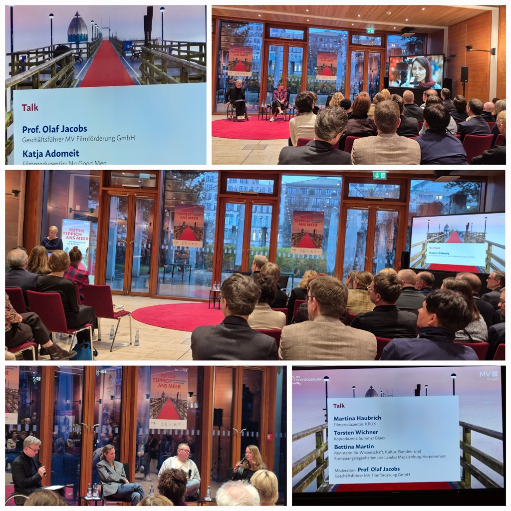 Nach der offiziellen Eröffnungsrede von Manuela Schwesig, gab es eine interessante Talkrunde wo der Geschäftsführer der MV-Filmförderung Prof. Olaf Jacobs mit den Gästen : Katja Adomeit, Produzentin NO GOOD MEN, Martina Haubrich, Produzentin KRUX , Torsten Wichner, Koproduzent SUMMER BLUES ,Kulturministerin Bettina Martin zum Thema „Koproduzieren in MV“ sprach. Kulturministerin Bettina Martin sowie der Geschäftsführer der MV Filmförderung, Olaf Jacobs, gaben in Berlin auch die neue Förderung bekannt.