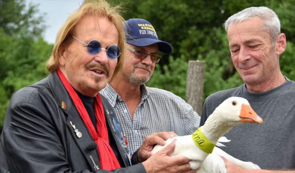 Frank Zander mit Gans auf dem Spargelhof Kremmen.