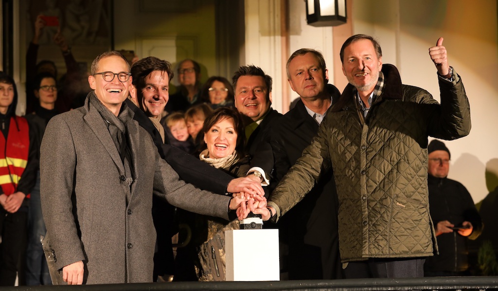 Eröffnung „Weihnachten im Tierpark“: Bild (v.l.n.r.): Regierender Bürgermeister von Berlin Michael Müller, DEAG-Vorstand Christian Diekmann, Sängerin Ute Freudenberg, Senator für Inneres und Sport von Berlin Andreas Geisel, Vorstandsvorsitzender der Zoologischer Garten Berlin AG Frank Bruckmann, Zoo- und Tierpark-Direktor Dr. Andreas Knieriem