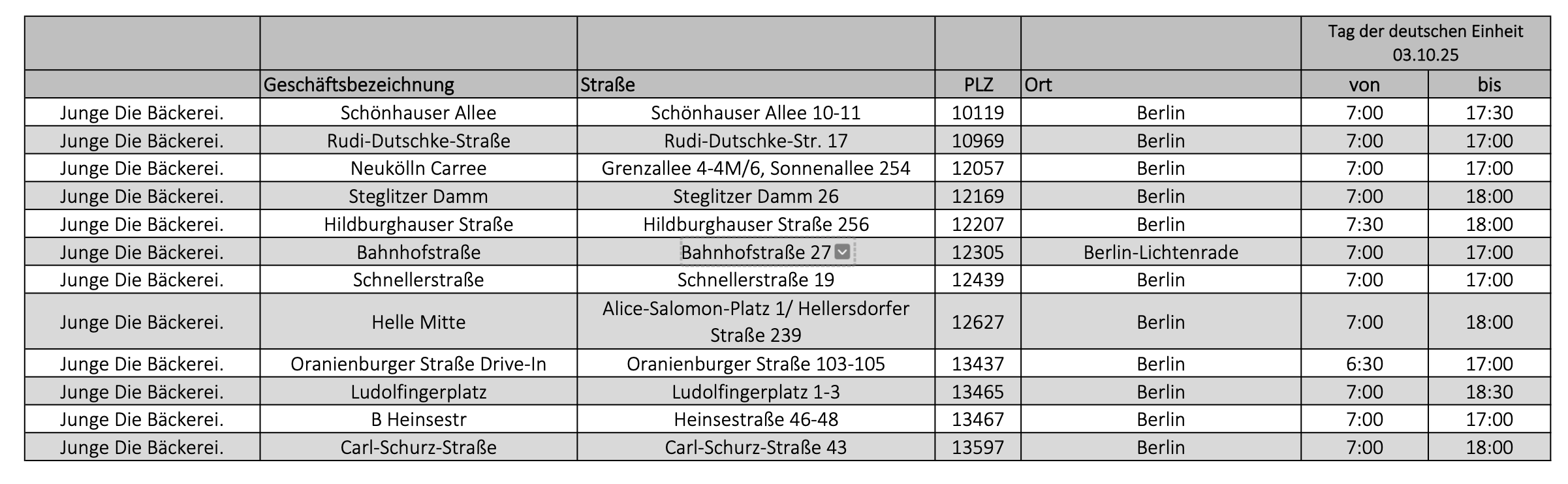 Der 3. Oktober ist nicht nur ein Tag der Erinnerung, er läutet auch ein verlängertes Wochenende ein – Zeit für Muße, gutes Essen und ein entspanntes Frühstück. Damit Genießer am Tag der Deutschen Einheit nicht auf frisch gebackene Brötchen verzichten müssen, stellt »Junge Die Bäckerei.« eine Übersicht der Feiertags-Öffnungszeiten bereit.