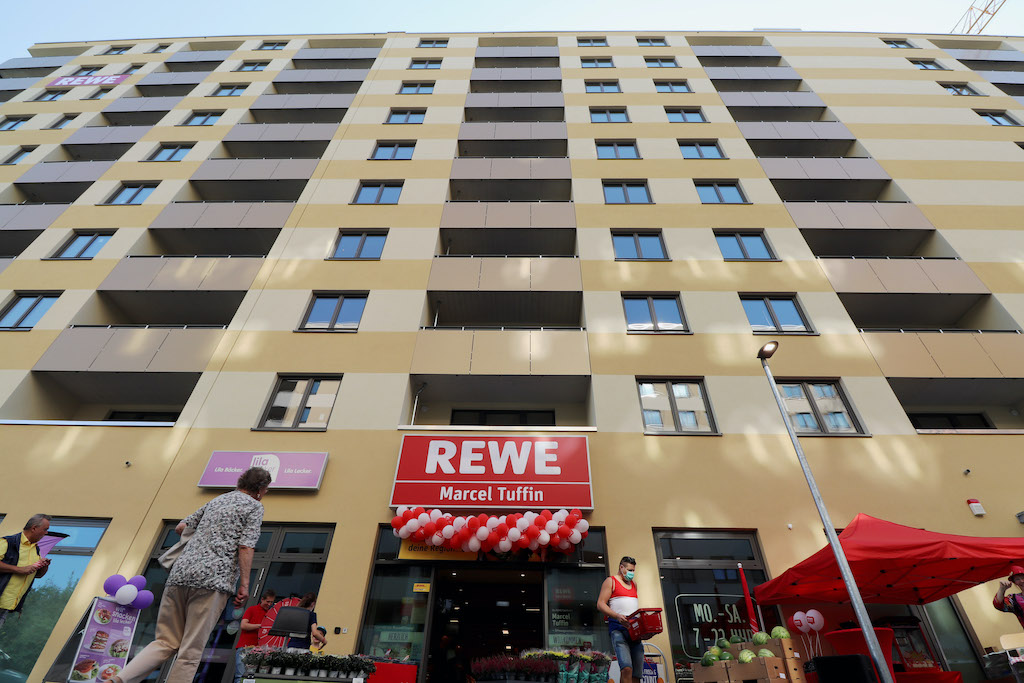 REWE_B-Lichtenberg, Dolgenseestr._Markt außen Wenn man über einem Supermarkt wohnt, hat man die Speisekammer direkt im Erdgeschoss.