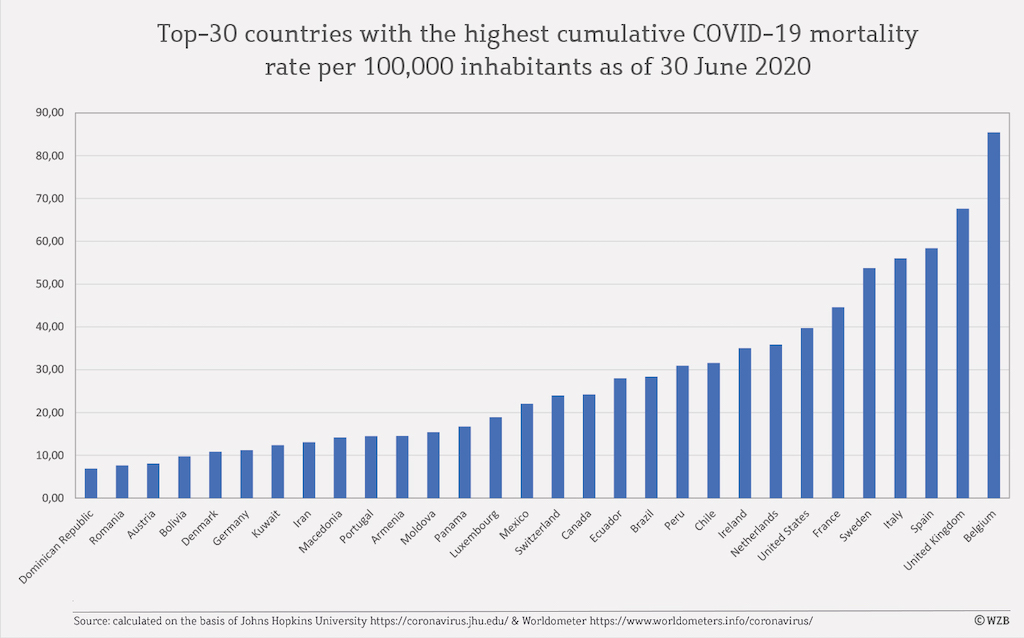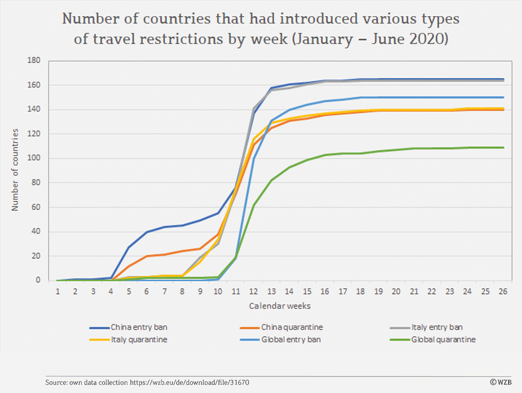 Zu den Ländern, die frühzeitig Reisebeschränkungen einführten und dadurch die Todesfälle erheblich begrenzen konnten, gehören zum Beispiel Australien, Israel und Tschechien. Länder, die spät reagierten, sind etwa Großbritannien, Frankreich und Brasilien. Deutschland führte Reisebeschränkungen eher spät ein, allerdings nicht so spät wie die letztgenannten Länder.