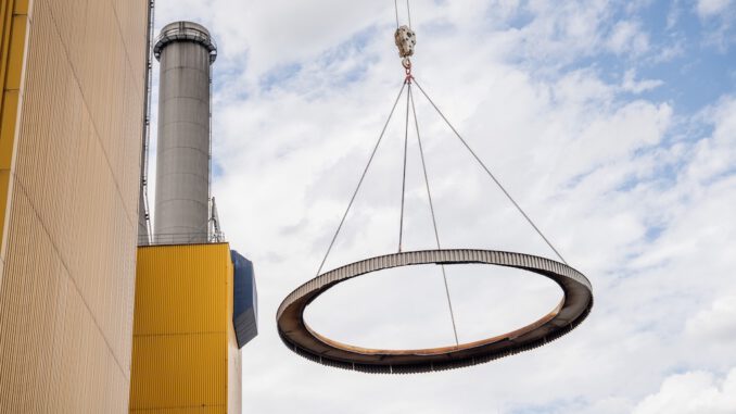 Das erste abgelöste Teil hängt am Haken und damit wird sich von nun an die Wilmersdorfer Skyline verändern. Seit dem 1. April ist das Heizkraftwerk Wilmersdorf vom Netz, jetzt beginnt der weithin sichtbare Rückbau der drei großen Kesselhäuser mit ihren Schornsteinen. Der rote Kran mit seinem langem Ausleger und einer Höhe von 126 Metern überragt die Maschinenhäuser des markanten Energiestandortes bei Weitem. Beginnend am alten Block1 werden die Schornsteine und Kesselhäuser mit Hilfe des Krans von oben nach unten abgetragen, schon Ende 2022 soll der Rückbau abgeschlossen sein.
