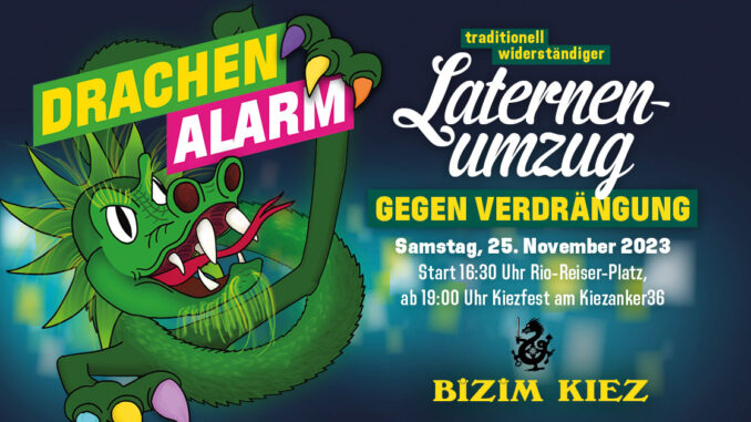 Am Samstag ziehen beim neunten „Widerständigen Laternenumzug gegen Verdrängung“ der Nachbarschaftsinitiative Bizim Kiez mehrere hundert Kinder und Erwachsene mit Laternen und leuchtenden kreativen Protestbotschaften durch Kreuzberg – angeführt von zwei funkelnden, rauchspeienden Drachen von bis zu zehn Metern Länge. „Zusammen werden wir zum Kiezdrachen“ – der Drache ist das Symbol für Solidarität und Wehrhaftigkeit gegen Verdrängung. Das diesjährige Motto „Drachenalarm!“ spielt auf die zahlreichen Verdrängungsfälle an, welche die Nachbarschaft massiv unter Druck setzen und zum Protest mobilisieren.