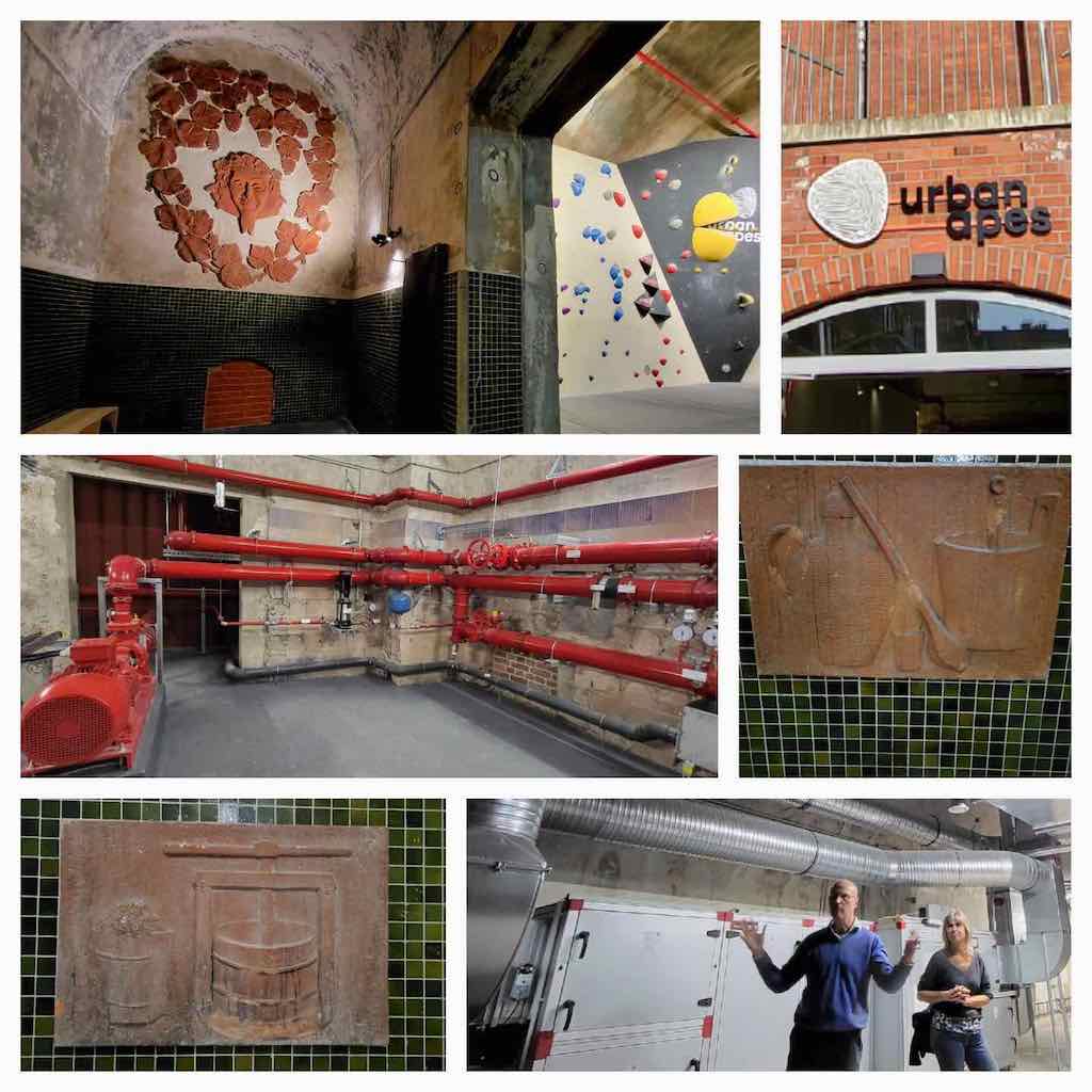 Es ist faszinierend, die verschiedensten Gänge im Gewölbe, und sicher auch eine Herausforderung, denn auch der Denkmalschutz mußte berücksichtigt werden.  An einigen Stellen im Flurbereich sind noch die alten Fliesen und Reliefs erhalten und erinnern an die Ursprüngliche Nutzung des Gewölbes. Eine riesige Klimaanlage sorgt dafür, dass hier ständig 20 Grad vorherrschen. Besonders im Sommer, wenn die Außentemperaturen auf über 30 Grad steigen, ist die Boulderhalle ein Ort, an dem man trotzdem Sport treiben kann.