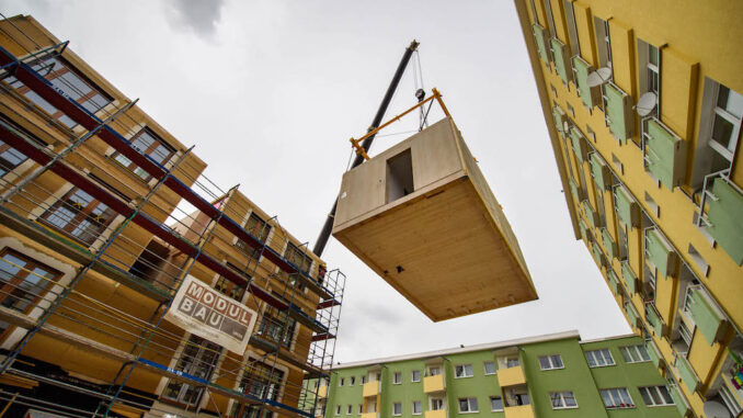 Insgesamt entstehen in dem in Modulbauweise errichteten Gebäude 60 überwiegend barrierefreie Wohnungen sowie im Erdgeschoss eine Gewerbeeinheit. Die Module für das Erdgeschoss und das erste Obergeschoss waren bereits im ersten Bauabschnitt Anfang 2021 aufgestellt worden.