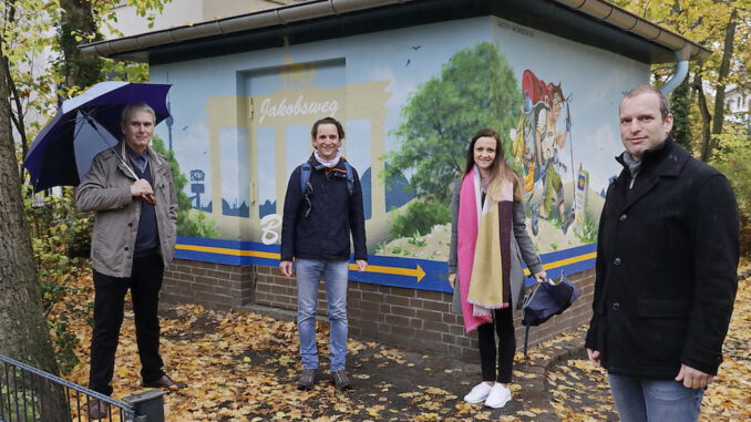 Warum in die Ferne schweifen, wenn das Gute so nahe liegt?! Am 30. Oktober wurde am Drachenspielplatz in der Sembritzkistraße (Berlin-Steglitz) die erste Jakobsweg-Trafostation eingeweiht. An dem Termin zur feierlichen Enthüllung des vom Künstler Mario Winkler gestalteten Trafohäuschens nahmen Frank Mückisch, Stadtrat für Bildung, Kultur, Sport und Soziales des Bezirkes Steglitz-Zehlendorf, Claudia Rathfux, Prokuristin und Leiterin Kunden- und Marktbeziehungen der Stromnetz Berlin GmbH, und Jörg Steinert vom Präsidium der Jakobusgesellschaft Brandenburg-Oderregion teil.