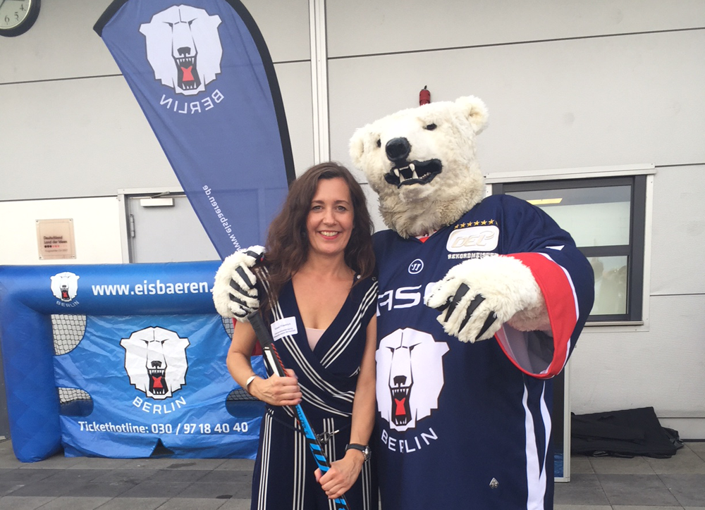 Susan Friedrich; Interessenvereinigung Mittelständische Wirtschaft e.V.; mit Eisbären-Maskottchen “Bully”
