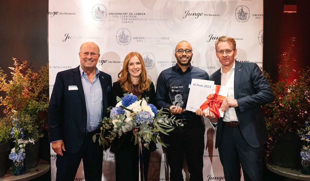 KI-Preisverleihung KI-Preis Gewinner 2025: Anne Patzer und Linus Kameni (beide Mitte). Ministerpräsident Daniel Günther (rechts) und Preisstifter Axel Junge (links) gratulieren. Foto: Junge Die Bäckerei.