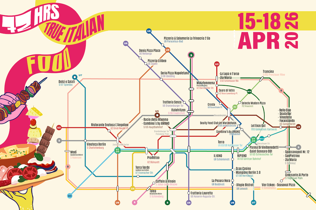 Um die kulinarische Tour noch einfacher zu machen, wurde die 72 hrs True Italian Map entwickelt – angelehnt an den Linienplan des Berliner Nahverkehrs. Sie zeigt, nach Stadtteilen geordnet, alle teilnehmenden Lokale mit den jeweiligen Adressen und angebotenen Spezialitäten. Die Karte wird in Kürze als Flyer in allen teilnehmenden Restaurants erhältlich sein. Eine digitale Version steht außerdem auf Google Maps zur Verfügung.