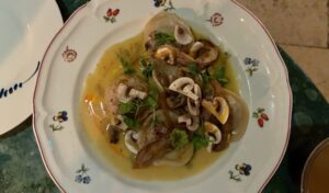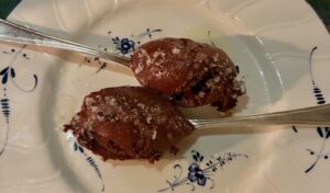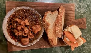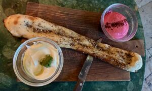 Unser Abend begann mit „Kubaneh“, serviert mit Roter-Beete- und Meerrettich-Aioli, Crème fraîche und dem würzigen Schmelz von Zhug. Als Vorspeisen folgten „ACHT“ – perfekt gegarter Oktopus mit Feta-Aioli, gebranntem Gemüsesalat und Meerrettich – sowie „Kaiser Brülle“, eine Kombination aus Auberginencreme, Tahini, Chiliflocken und geröstetem Challah. Bei den Hauptgängen beeindruckten die „99 Balloons“ (ein Josper-gegarter Wolfsbarsch) sowie die „The Bolshoi Dumplings“: Pilz-Pelmeni in einer karamellisierten Zwiebel-Tatbila-Beurre-Blanc-Sauce. Den krönenden Abschluss bildeten der „Jerusalemer Cheesecake“ und „Beni Mousse“, eine Schokoladenmousse veredelt mit Olivenöl und reichlich Maldon-Salz.