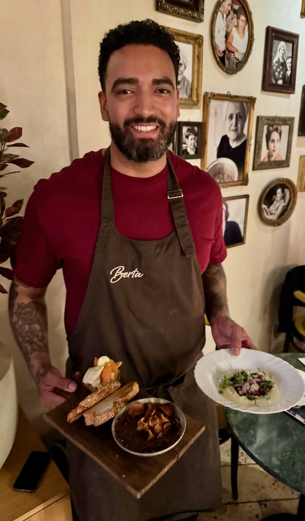Wer das Berta betritt, spürt sofort die familiäre Wärme, die das gesamte Konzept durchzieht. An der Wand hängen die Fotos der Omas aller Mitarbeiter – sie bestimmen mit ihrem Verständnis von guter, liebevoller Heimatküche, wie hier gekocht und wie Gäste umsorgt werden. In der Mitte thront Oma Berta, die Großmutter von Assaf Granit und Namensgeberin des Lokals. Die Geschichte ihrer Flucht aus Berlin nach Tel Aviv und die Rückkehr ihres Enkels an diesen Ort verleihen dem modern gestalteten Interieur eine tiefe, persönliche Resonanz, die weit über das bloße Design hinausgeht.