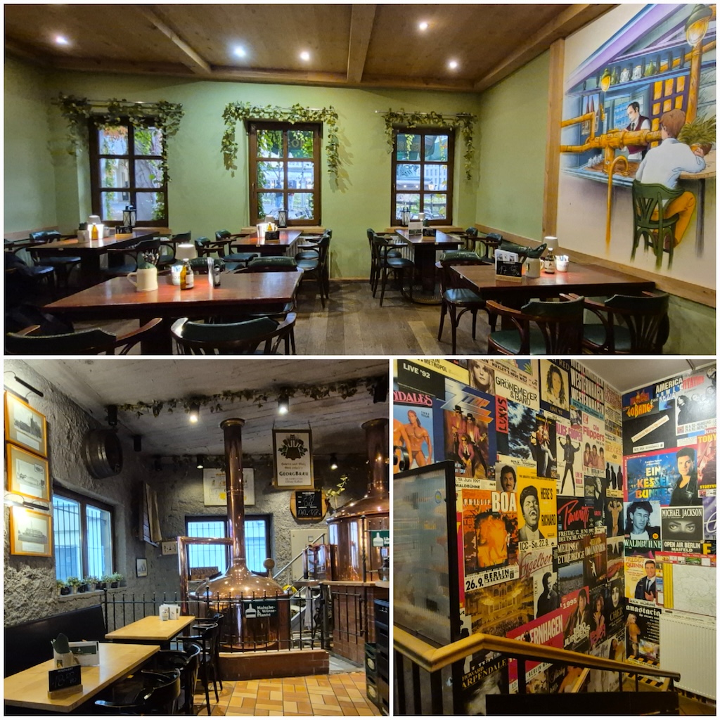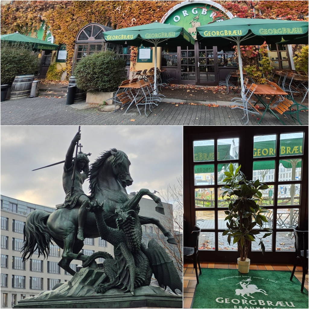 Die Lage an der Spree war schon immer anziehend. Wir gehen hinein, es wirkt einladend, gemütlich, imposant – die blank blitzenden Braukessel mitten in der Gaststube. Wir haben einen Platz in einem der sechs individuell gestalteten „Bierstuben“ mit Blick auf die Spree und das Denkmal des Heiligen Georg, der mit einem Drachen kämpft und Namensgeber für das Georgbräu ist. Der Heilige Georg ist eine Bronzeplastik großer Berliner Bildhauerkunst aus dem 19. Jahrhundert.