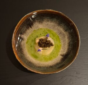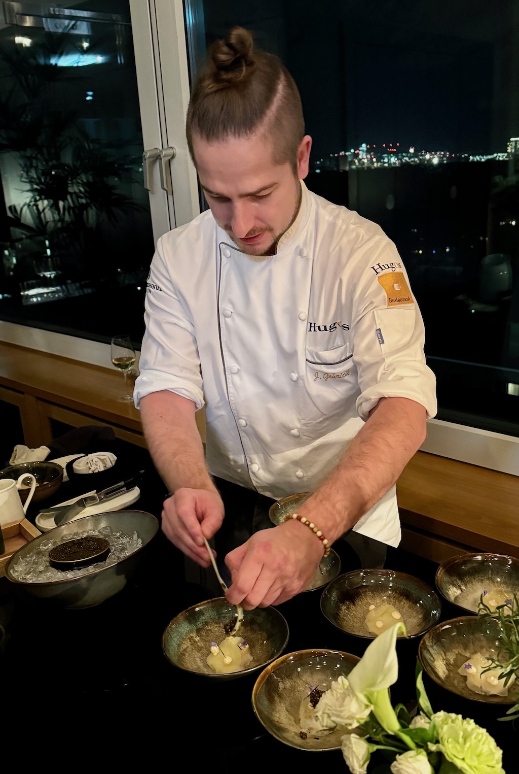 Im persönlichen Gespräch mit Gehrich merkt man sofort: Offenheit und Abenteuerlust hat er sich bewahrt. Er sprüht vor kulinarischen Ideen und Enthusiasmus, als er einige Journalisten in seiner Wirkungsstätte herumführt. „Die Küche hier oben steht für höchste Qualität, aber sie soll zugleich nahbar bleiben!“ Auf die Frage nach der Küchenrichtung will er sich nicht festlegen: „Ich nenne meinen Stil Berliner Freiheit – weil er sich traut, elegant und bodenständig zugleich zu sein.“ Bodenständigkeit im 14. Stock des Interconti bedeutet allerdings, dass das kleinste Menü, viergängig, 150 Euro pro Person kostet, Weinbegleitung extra. Seine Küche ist ein Bekenntnis zur Hauptstadt, zu Offenheit und zu Mut und findet sich auch in dem Gericht wider, das er an diesem Abend persönlich anrichtet: Schneekrabbe und Imperial-Kaviar auf Staudensellerie-Vinaigrette mit Mairübe, Yuzu, Apfel und Blüten.