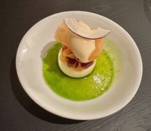 Der Nachtisch kam von Haus-Pâtissière Lisa Schröder, die kunstvoll Törtchen, Sorbet, Kalmansi-Frucht und weitere mysteriöse Ingredienzien auf einem Lorbeerölspiegel schichtete.