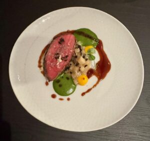 Lange, der das Hugos seit 2015 als Küchenchef prägte und ihm Jahr für Jahr den Michelin-Stern sicherte, verabschiedet sich auf ärztlichen Rat vorerst von der aktiven Küche. Heute steht er mit Gehrich noch einmal an improvisierten Pass im Restaurant und arrangieren zahlreiche Bestandteile der beiden Gerichte, die für die Berliner Gastrojournalisten zubereitet werden. Vom scheidenden Lange kommen Rindsfiletscheiben an jahreszeitlichem Schwarzwurzelgemüse mit Schäumchen aus Hokkaido-Kürbis, bekrönt mit einigen Hieben Périgord-Trüffel, fermentiertem Pfeffer und dem Schalenabrieb einer Zitrone der faszinierenden Sorte Buddha’s Hand.