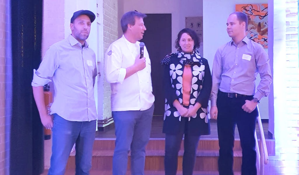 Caterer und Starkoch Markus Herbicht stellt seine Partner Bodo Haas – Eventwide – links -sowie Melanie Thomas und Ansgar Petters – Eventtation vor / Foto: P. Gütte