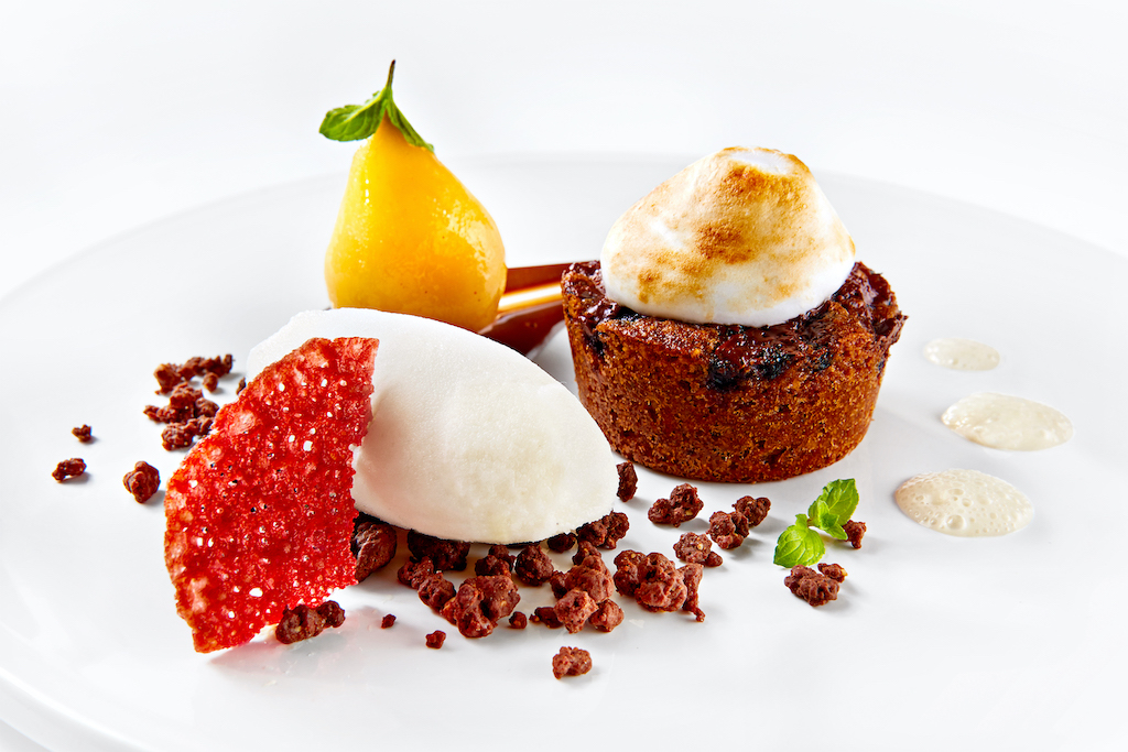 Serviert wurde – wie im Palazzo üblich – ein 4-Gänge-Menü. Als Vorspeise kam eine Kabeljauschnitte mit Sauce Rouille, knuspriges Kapernbrot und Grapefruit auf den Tisch. Der Zwischengang bestand aus einem aufgeschäumten Süppchen von Gorgonzola und Kohlrabi mit gebackenem Ziegenkäse. Für den Hauptgang wurde eine knusprige „Ente à l’orange“ mit Orangensauce, Miso-Spitzkohl und Kartoffelgratin angerichtet. Das süße Finale bildete ein warmes Holunder-Nougat-Törtchen mit Baiserhaube, pochierte Birne, Sauerrahmreis und Schokoladenganache.