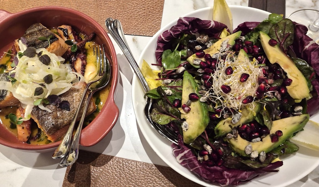 Hiddenfjord-Lachs mit Oktopus auf einem Sellerie-Fenchel-Salat und Orangen-Madeira-Sauce. Daneben winterliche Blattsalate mit Granatapfel, Avocado und Kürbiskernen.