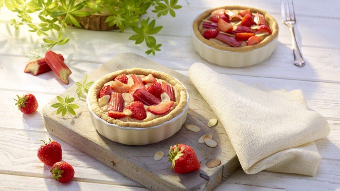 Ob süß oder herzhaft – Tarten, französische Kuchen aus Mürbeteig, trumpfen in allen Variationen auf. Eine Tarte ist kinderleicht gebacken und sorgt doch jedes Mal für reihenweise glückliche Gesichter. Die Rhabarber-Erdbeer-Mandel-Tarte, mit ihrem festen Teigboden und dem frischen, saftigen Belag, sorgt für eine spannende Kombination aus frischer Frucht und herzhaftem Teig. Den Höhepunkt bilden eindeutig die frischen Erdbeeren und der knackige Rhabarber.