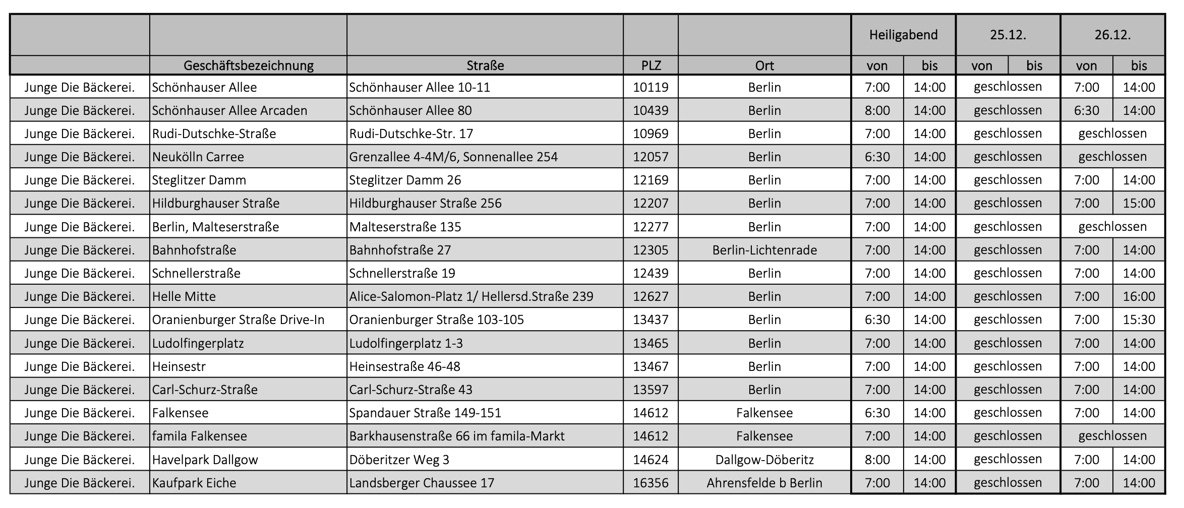 Die Übersicht von »Junge Die Bäckerei« zeigt, welche Bäckerei-Cafés an den Feiertagen geöffnet haben. Alternativ sind die Öffnungszeiten für jedes Geschäft auf der Website des Unternehmens (jb.de) abrufbar.