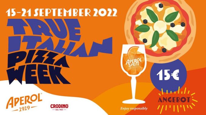 Die True Italian Pizza Week 2022 findet vom 15. bis zum 21. September in ausgewählten Pizzerien der verschiedenen Städte statt. Während dieser Woche kann man in den beteiligten Restaurants ein spezielles Menü probieren: Eine authentische italienische Pizza (zur Auswahl stehen immer zwei Sorten) zusammen mit einem Aperol Spritz oder einem alkoholfreien Crodino für nur 15 €. Eine Eintrittskarte für das Event ist nicht erforderlich, man muss sich einfach in die teilnehmenden Lokale begeben und nach dem Eventangebot fragen. Für jede Stadt steht auch eine spezielle Karte zur Verfügung, sowohl als Flyer als auch auf Google Maps: Auf dieser sind alle am Event teilnehmenden Pizzerien gezeigt.