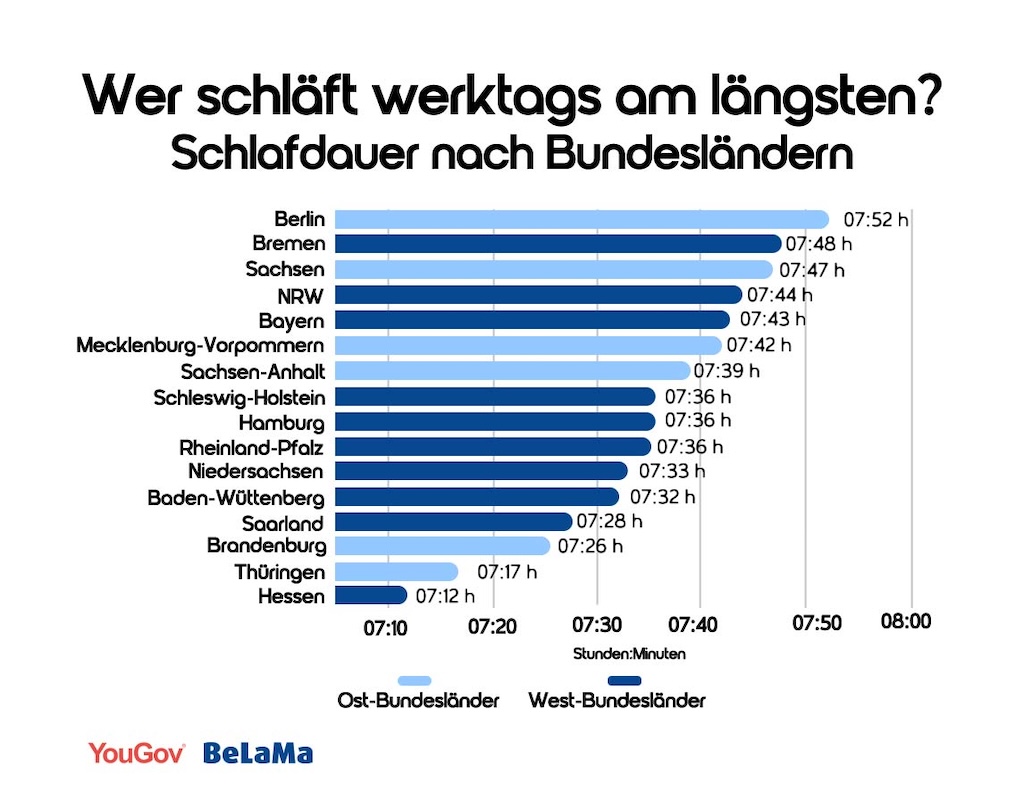 Berlin schläft an Arbeitstagen am längsten: Mit durchschnittlich 7 Stunden und 52 Minuten pro Nacht sichern sich die Berliner:innen den Spitzenplatz – 40 Minuten mehr als in Hessen (7:12 Std.), dem Schlusslicht im bundesweiten Vergleich. Auch Bremen (7:48 Std.) und Sachsen (7:47 Std.) liegen vorn.