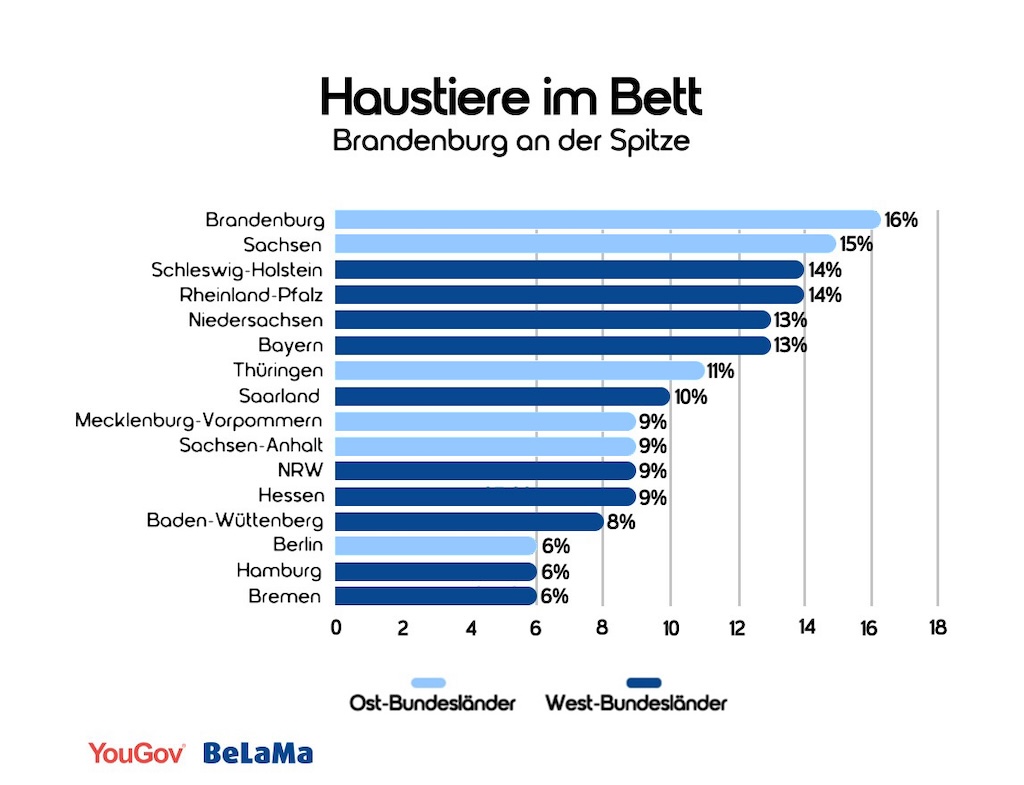 Brandenburg liegt vorn beim Schlafen mit Haustier: 16 % der Befragten teilen dort regelmäßig das Bett mit Hund oder Katze. Damit liegt Brandenburg weit vorne. In Berlin, Hamburg und Bremen sind es lediglich 6 %. Die Daten zeigen: In ländlichen Regionen gehört das Haustier häufiger zur Nachtruhe.