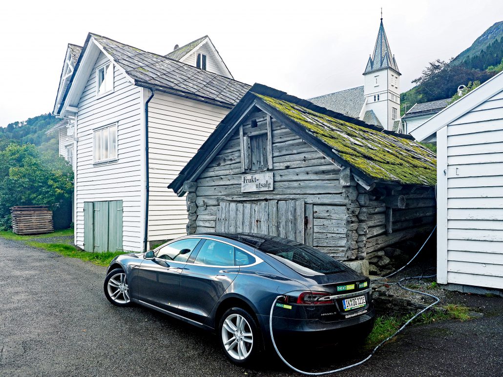Tesla S 90 D zum nächtlichen Laden in Utne an einem versteckten Strompunkt angeschlossen.