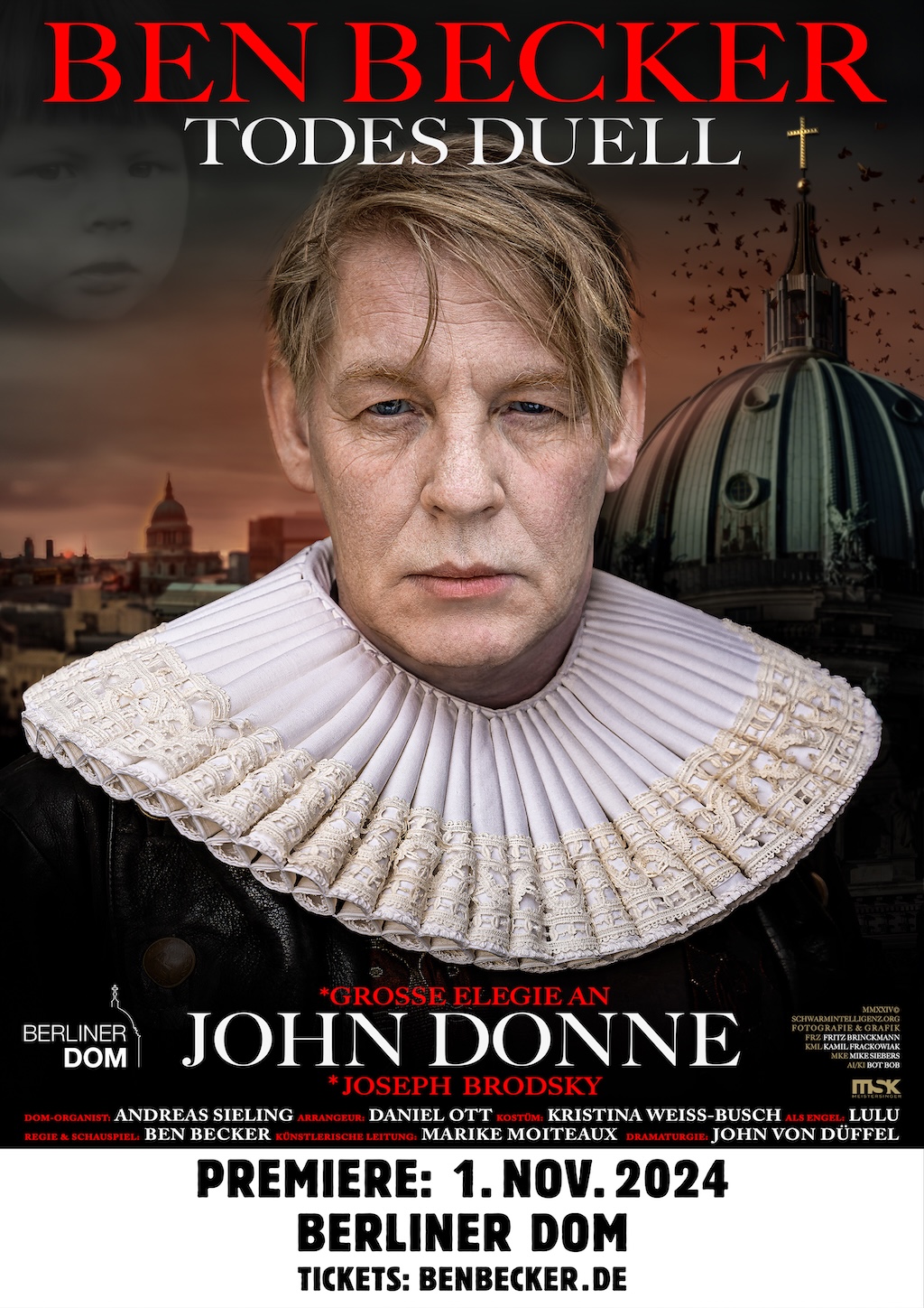 Ben Becker startet mit vielfältigen Projekten in die Spielzeiten 2025 und 2026. Nach der großen Resonanz auf seine Inszenierung „Todesduell“ und den bereits wenigen Restkarten der Premieren, wurden nun zwei weitere Aufführungstermine im Herbst 2025 bekanntgegeben. Dieses Stück ist ein besonderes Bühnenereignis, da Ben Becker erstmals gemeinsam mit seiner Tochter Lilith Maria Dörte Becker auftritt. Die Inszenierung basiert auf der kraftvollen Predigt des englischen Dichters John Donne und wird an zwei kulturell und historisch bedeutenden Orten präsentiert: Am 24. Oktober 2025 in der Hamburger Hauptkirche St. Michaelis und am 28. November 2025 im Berliner Dom (Einlass: 19:00 Uhr, Beginn: 20:00 Uhr). Tickets für diese Aufführungen sind ab sofort unter www.reservix.de erhältlich.