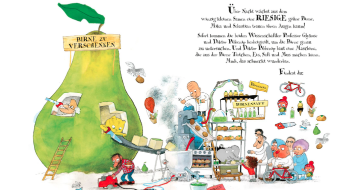 Die Freunde Mika und Sebastian staunen nicht schlecht: In ihrem Garten ist über Nacht eine gigantische Birne gewachsen. Ein wahres Wunder der Natur! Nur wegbewegen lässt sich die Riesenfrucht nicht, dafür ist sie viel zu schwer. So wird kurzerhand beschlossen, sie auszuhöhlen und nach und nach abzutransportieren. Doch durch ein Missgeschick setzt sich der Anhänger mit der ausgehöhlten Riesenbirne darauf in Bewegung und landet mit einem Riesenplatsch im Meer. Mit an Bord: Mika und Sebastian, die fortan einem großen Abenteuer entgegenschippern …