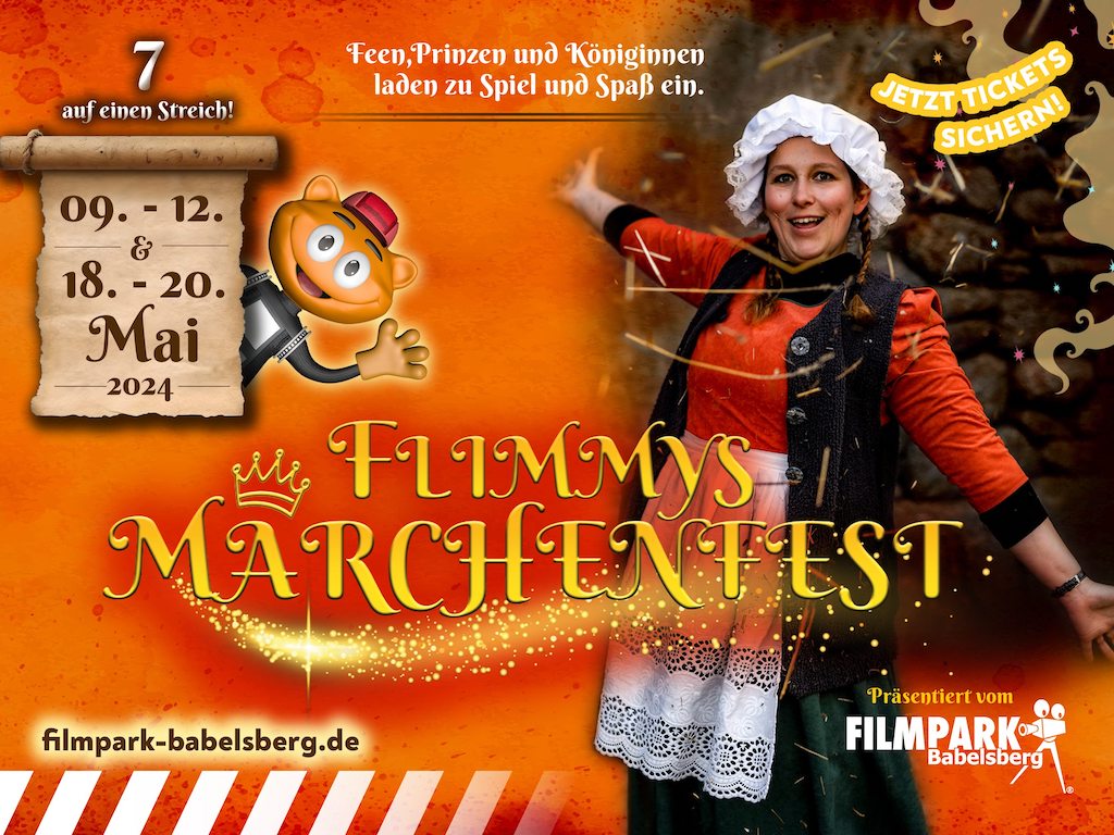 7 auf einen Streich heißt es bei Flimmys Märchenfest! Im Filmpark Babelsberg öffnet sich am Himmelfahrts- und Pfingstwochenende die magische Märchentruhe. Fabelhafte Gestalten erwachen zum Leben und laden zu Spiel, Spaß und Schabernack ein. Unter anderem warten Feen, Prinzen und Königinnen an lustigen Mitmachstationen und Märchenfilmsets auf kleine und große Hauptdarsteller. Filmpark Maskottchen Flimmy ist natürlich ebenfalls mit dabei und freut sich auf viele Erinnerungsfotos mit seinen Gästen. Jede Menge Spaß ist vorprogrammiert durch die beliebten Mitmach-Märchen der Theatergruppe „Rumpelmärchen“.