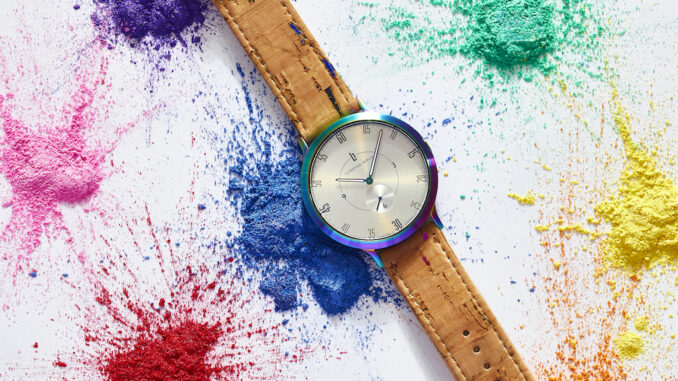 Erhältlich ist die L1 Rainbow mit einer Gehäusegröße von 42,5mm und 37,5mm und kommt mit regenbogenfarbenen Zeigern und einem sonnengeschliffenen Zifferblatt, das je nach Lichteinfall anderes Farbspiel bietet. Auch bei den Armbändern hat Lilienthal Berlin nicht an Farbe gespart. Zur Auswahl stehen drei Armbänder: ein Mesh-Armband in Regenbogenfarben, ein veganes Kork- Armband mit eingearbeiteten Regenbogenelementen sowie ein pflanzlich gegerbtes Lederarmband in der Farbe Waikiki.