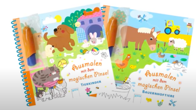 Weitere im Arena-Verlag erhältliche Kreativbücher für Kinder sind zum Beispiel Ausmalen mit dem magischen Pinsel – Bauernhoftiere und Stempelkunst für kleine Finger.