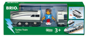 Festhalten, die Fahrt geht los! Diese Batterielok ist das schnellste Fortbewegungsmittel in der BRIO World. Der moderne BRIO Turbo-Zug bringt damit mehr Tempo als alle bisherigen Züge auf die Schienen. Durch Drücken der Richtungsknöpfe auf der Oberseite der Lok startet die Fahrt. Betätigen Eisenbahnfans den Turbo-Knopf, verdoppelt sich die Geschwindigkeit für fünf Sekunden. Im Anschluss setzt die Lok ihre Fahrt in normalem Tempo fort. Damit stellt der Zug einen neuen Geschwindigkeitsrekord in der BRIO World auf. Ein Farbspiel unterstreicht den rasanten Fahrspaß: Während der Rekordhalter über die Schienen flitzt, leuchtet er seitlich in Dunkelblau. Setzt er seine Fahrt in normaler Geschwindigkeit fort, wechselt der Leuchtstreifen an der Seite zu einem Hellblau. Beim Rückwärts-Gang wechselt die Farbe in ein helles Rot. Zur Lok gehört außerdem ein Passagierwaggon mit Fahrgast.